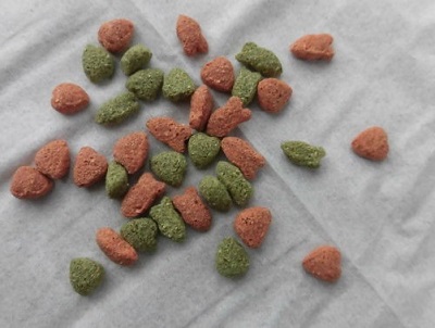 ペレットの色は、赤(茶色)と緑の二種類。